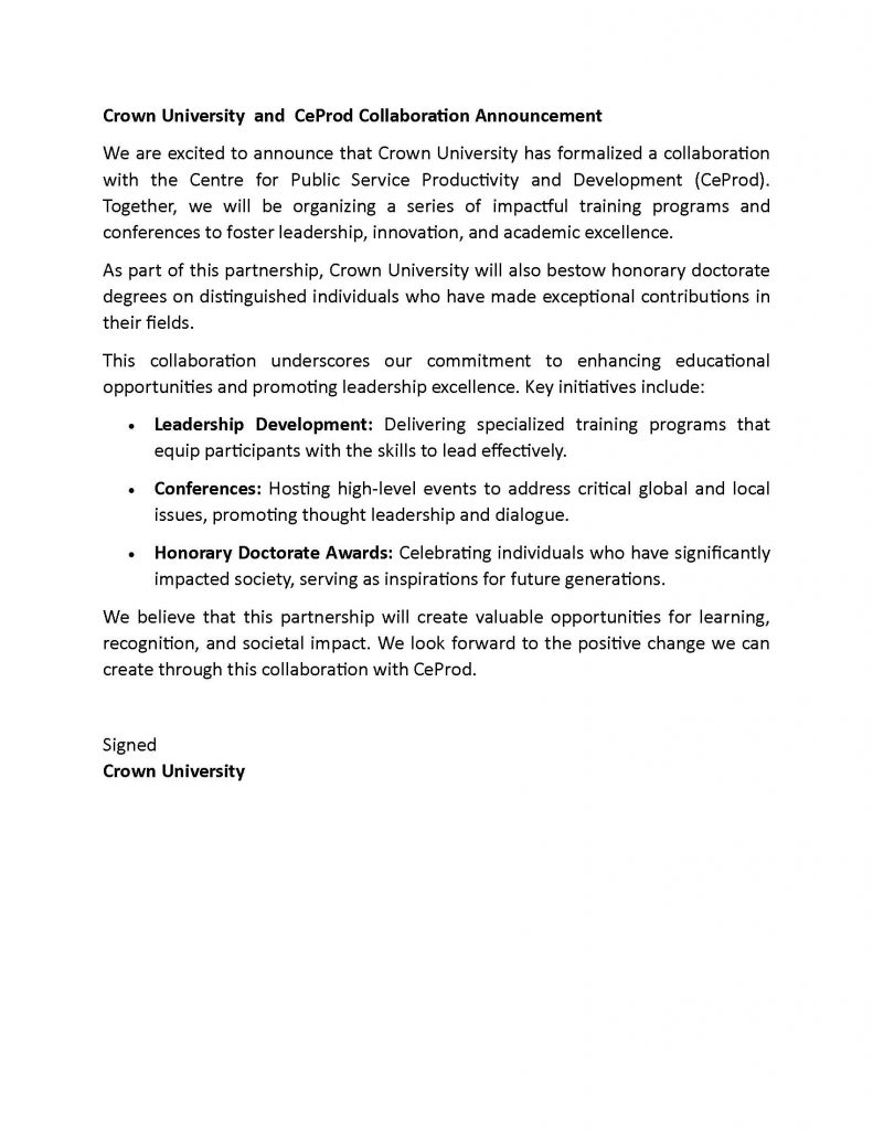 I have taken up the mantle of leadership of the University, partner campuses world-wide at a time of stiff competition in the higher education landscape and weak financial health of most private universities in the world including Crown University and partner